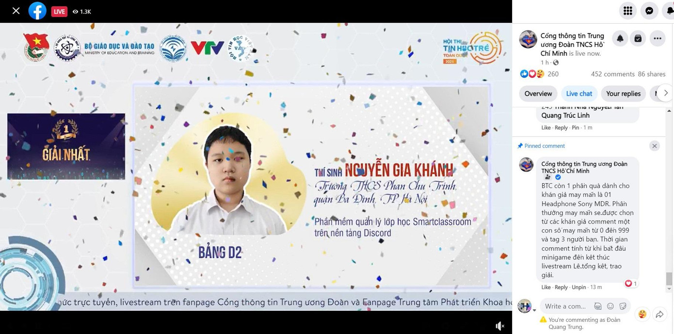Giải Nhất bảng D2 (bảng sản phẩm sáng tạo cấp THCS) được trao cho thí sinh Nguyễn Gia Khánh (Trường THCS Phan Chu Trinh, Q.Ba Đình, TP.Hà Nội) với sản phẩm “Phần mềm quản lý lớp học Smartclassroom trên nền tảng Discord”.
