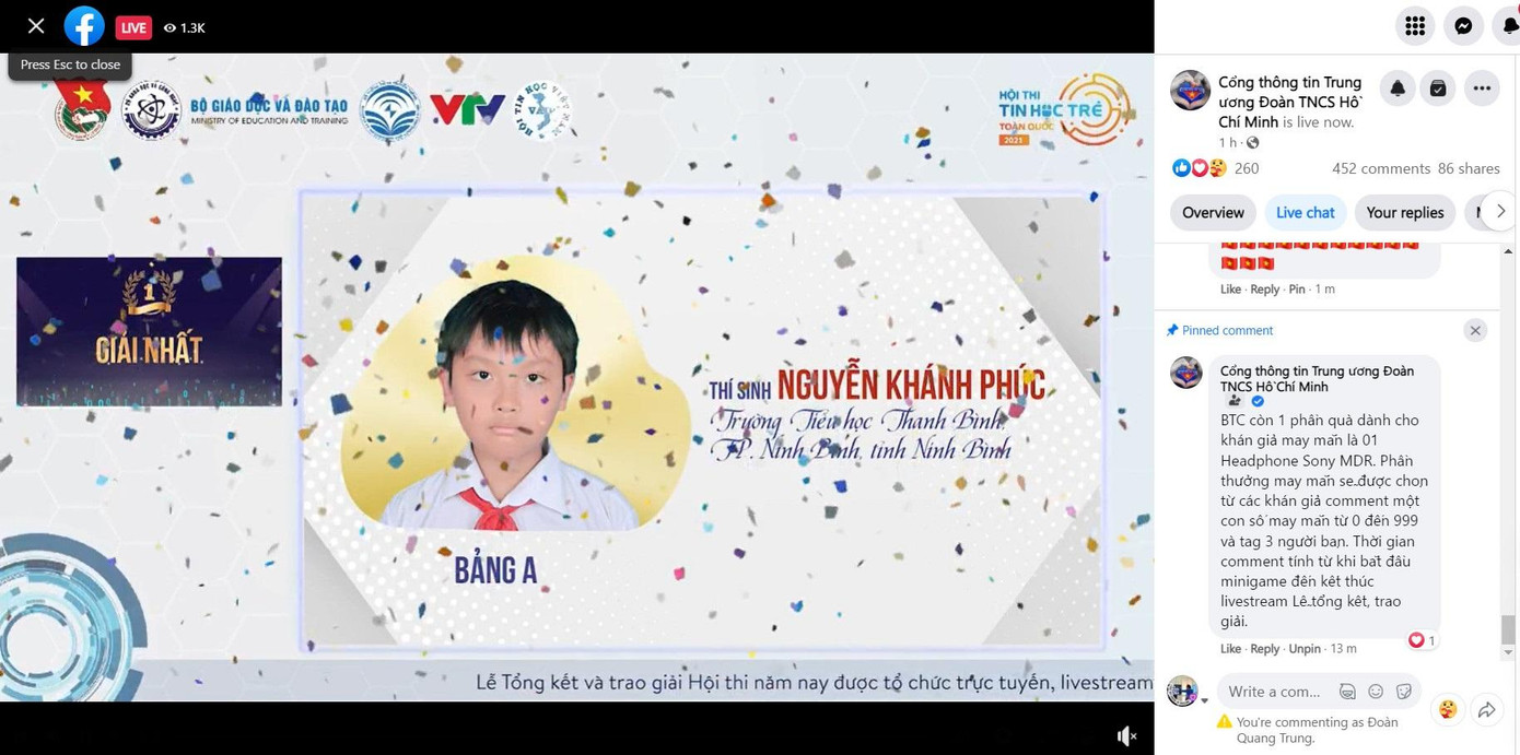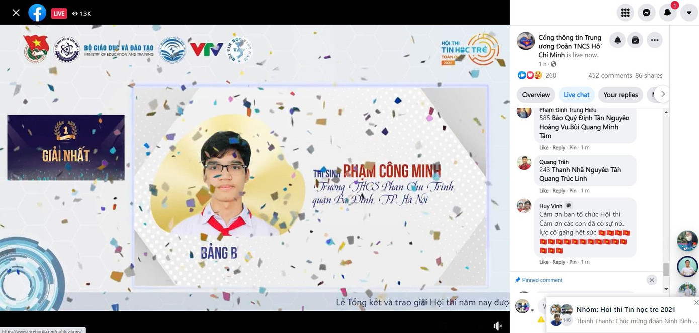 Ngày 28/11, Lễ tổng kết và trao giải Hội thi Tin học trẻ toàn quốc đã diễn ra trực tuyến với sự tham dự của anh Bùi Quang Huy, Ủy viên dự khuyết T.Ư Đảng, Bí thư thường trực T.Ư Đoàn; anh Nguyễn Minh Triết, Bí thư T.Ư Đoàn, Phó chủ tịch thường trực Hội SVVN.