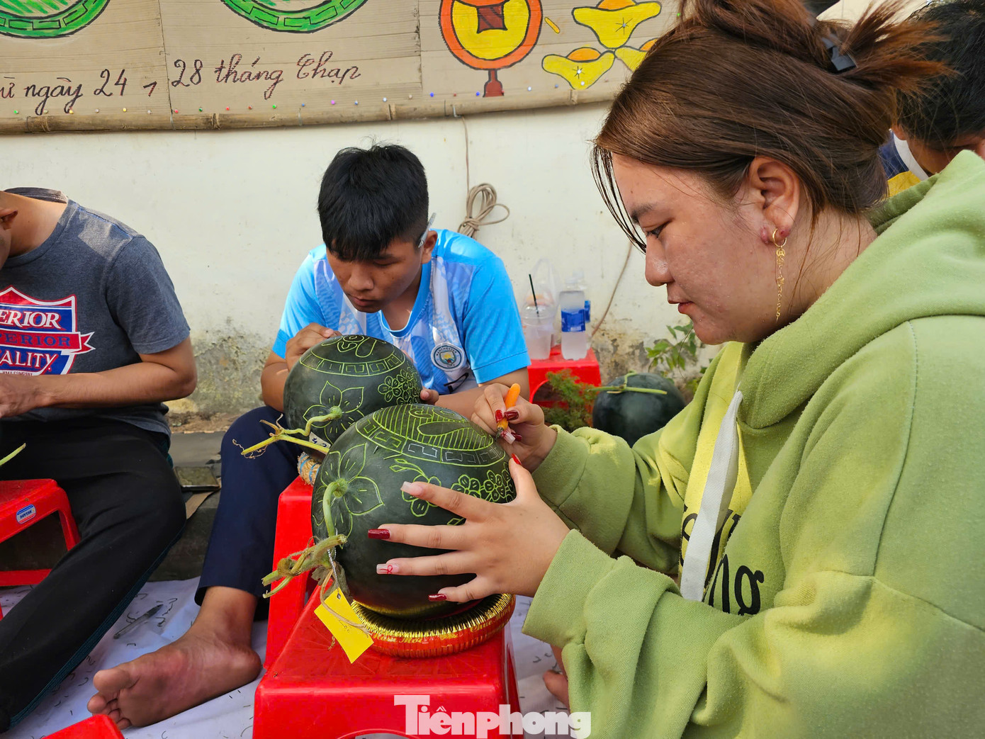 Ngày 27/1, ghi nhận của PV Tiền Phong, trước cổng Trường dạy trẻ Khuyết tật TP. Cần Thơ (đường Cách mạng tháng 8, quận Bình Thủy) trở nên nhộn nhịp với cảnh nhóm hơn 10 em đều bị câm, điếc đang miệt mài khắc từng chữ thư pháp lên dưa hấu.
