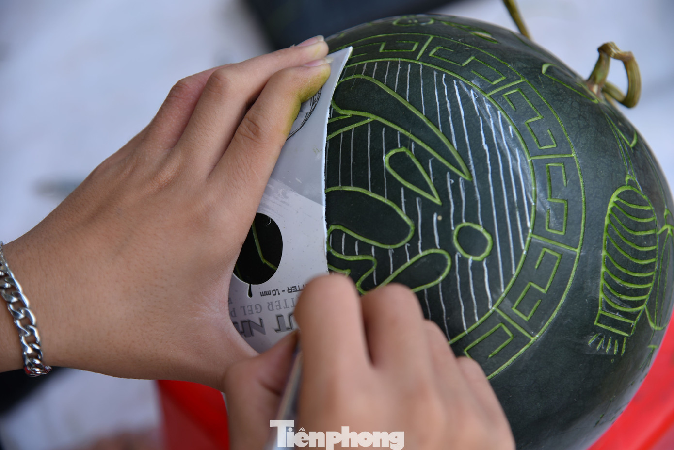 Bên cạnh việc khắc sẵn các chữ phúc - lộc - thọ, tài - lộc… các em còn nhận khắc dưa theo mẫu mã khách yêu cầu. Mỗi trái dưa được khắc thủ công tỉ mỉ, các em nhận tiền công 50.000 đồng.