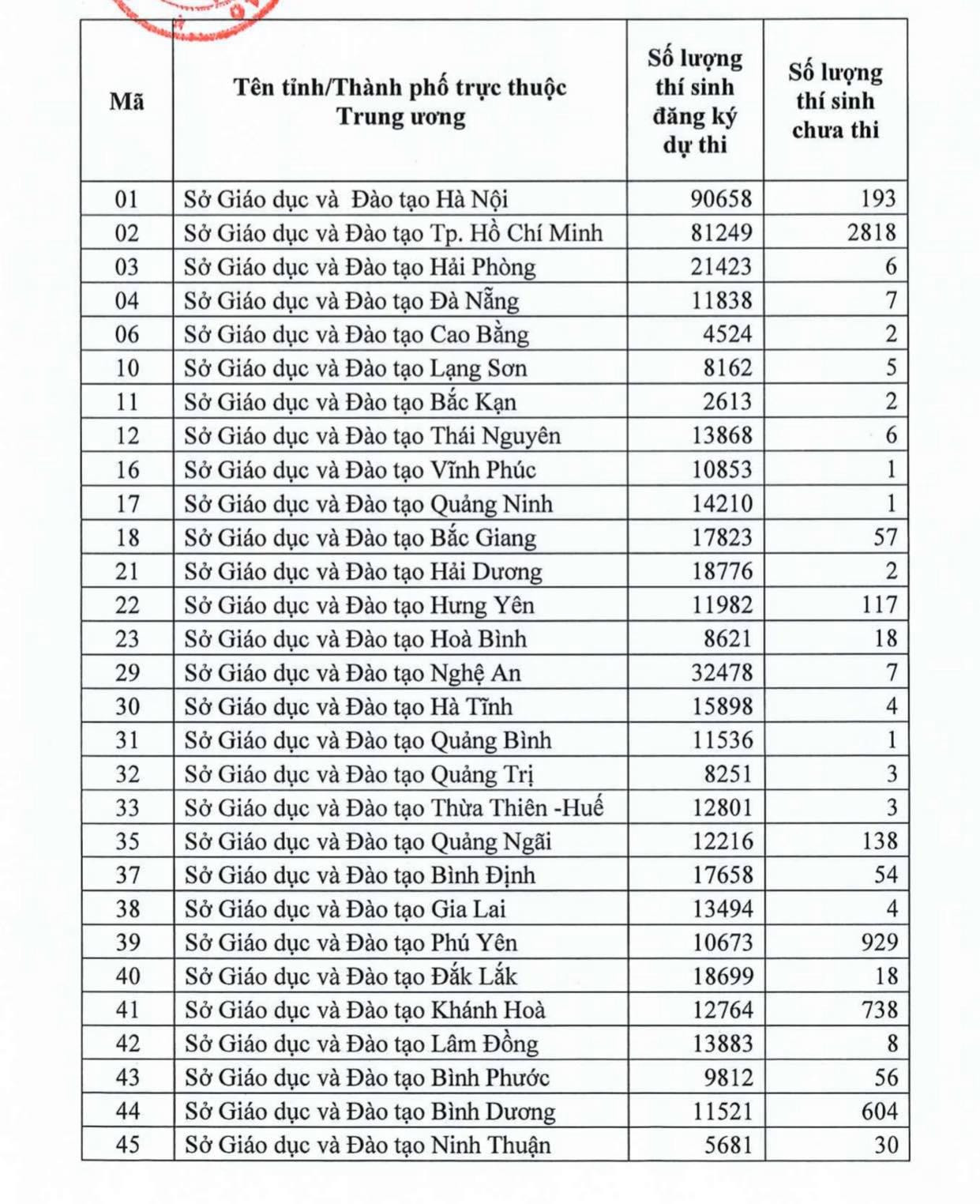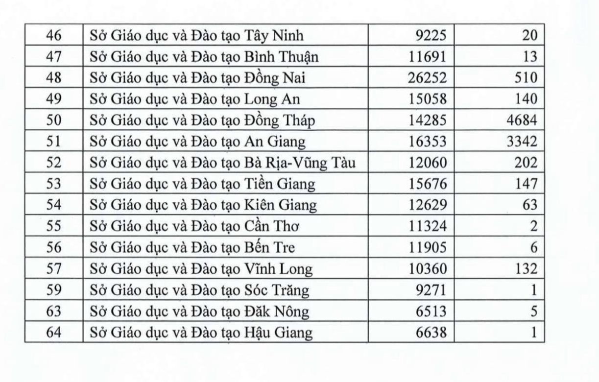 Ba địa phương có số lượng thí sinh lớn nhất không dự thi tốt nghiệp THPT đợt 2 là Đồng Tháp đứng đầu với 4.684 thí sinh; An Giang đứng thứ 2 là 3.342 thí sinh và TPHCM đứng thứ 3 là 2.818 thí sinh.