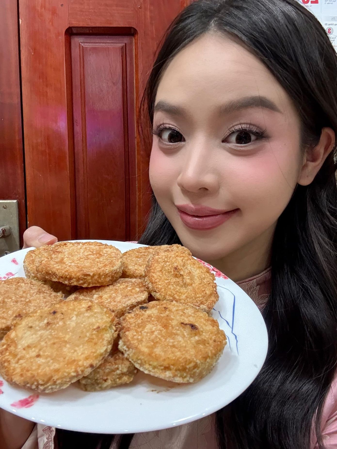 Hoa hậu Thanh Thủy hào hứng khoe đĩa bánh tét chiên vàng ruộm, sẵn sàng “phá lệ” nhâm nhi vài miếng. Bánh tét chiên rất dễ tăng cân, nhưng nàng hậu vẫn muốn tận hưởng món ăn đặc trưng của ngày Tết.