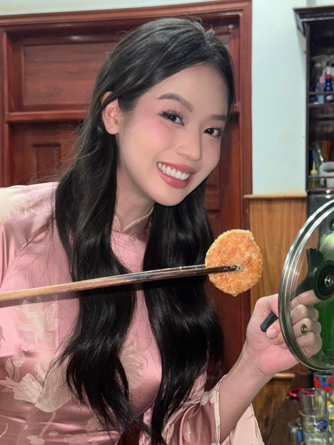 Khi được về nhà đón Tết cùng gia đình, Hoa hậu Thanh Thủy đã nhanh chóng vào bếp trổ tài làm món bánh tét chiên quen thuộc. Bánh tét hay bánh chưng chiên lên là món khoái khẩu của nhiều người vì lớp vỏ ngoài giòn trong mềm, ăn lúc nóng hôi hổi thì thơm ngon khó cưỡng.