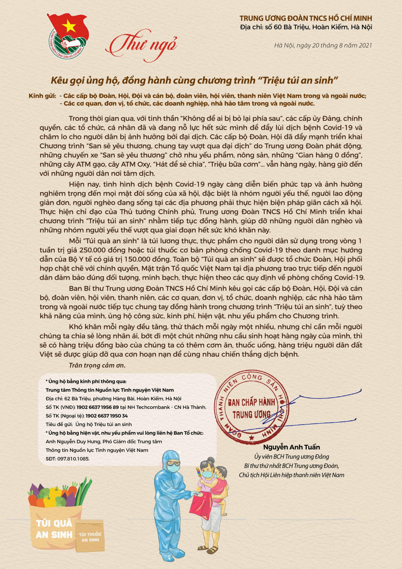 Ban Bí thư T.Ư Đoàn TNCS Hồ Chí Minh kêu gọi các cấp bộ Đoàn, Hội, Đội và cán bộ, đoàn viên, hội viên, thanh niên, các cơ quan, đơn vị, tổ chức, doanh nghiệp, các nhà hảo tâm trong và ngoài nước tiếp tục chung tay đồng hành trong chương trình “Triệu túi an sinh”, tuỳ theo khả năng của mình, ủng hộ công sức, kinh phí, hiện vật, nhu yếu phẩm cho Chương trình.