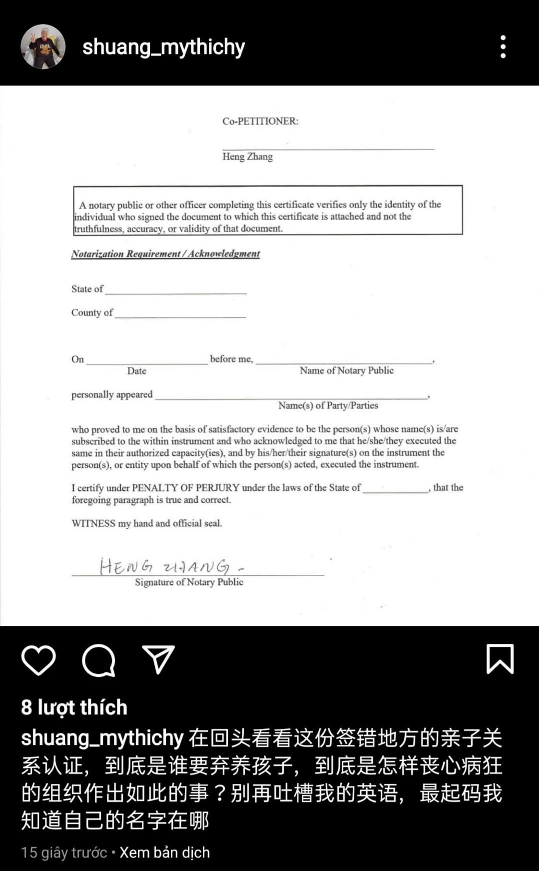 “Hãy nhìn lại xem chỗ ký sai của tờ xác nhận quan hệ cha mẹ - con cái này đi, rốt cuộc ai mới là người muốn bỏ con? Là tổ chức điên rồ nào đã làm ra chuyện này? Đừng phàn nàn về trình tiếng Anh của tôi nữa đi, ít nhất tôi còn biết tên mình ở đâu”, Trịnh Sảng đăng kèm tờ giấy xác nhận của cơ quan chức năng bằng tiếng Anh.