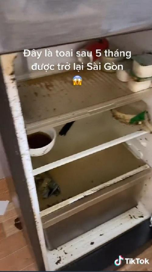 Bên trong tủ lạnh, thực phẩm như trứng gà, yaourt, bánh… đã thối rữa do không được bảo quản lạnh và những mảng đen ẩm mốc bám đầy thành tủ. Cô bạn giải thích: “Đây là tôi sau 5 tháng được trở lại Sài Gòn. Mấy bạn đừng nghĩ mình ở dơ nha. Mình cũng không hiểu sao lại bị như vậy”.