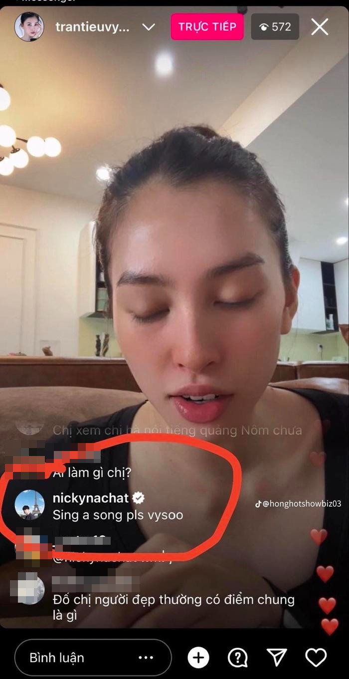 Mới đây, Tiểu Vy livestream trò chuyện với khán giả, tất nhiên là bằng tiếng Việt. Netizen tinh mắt đã nhận ra Nicky Nachat cũng theo dõi buổi livestream này và còn để lại lời nhắn. Tài khoản tick xanh của chàng diễn viên đã đề nghị Tiểu Vy hãy hát một bài, còn tếu táo gọi cô nàng là "vysoo" (ghép từ Tiểu Vy và Jisoo BLACKPINK), chứng tỏ Nicky Nachat đã biết tới giọng hát “lừng danh” của nàng hậu cùng bản cover Lửa hận thù (FLOWER).
