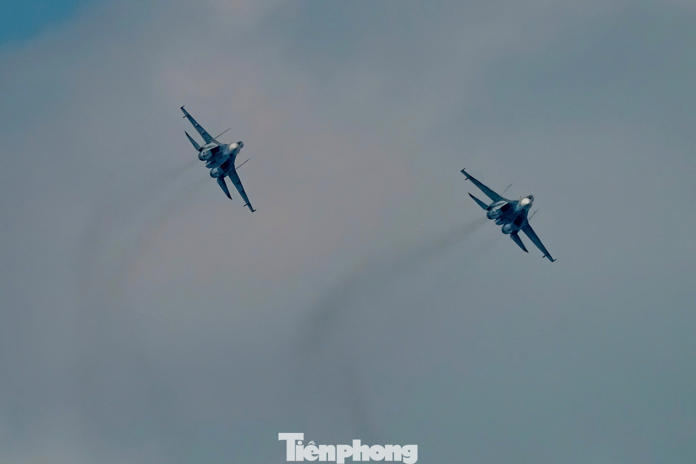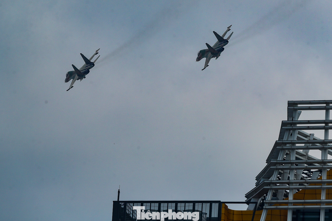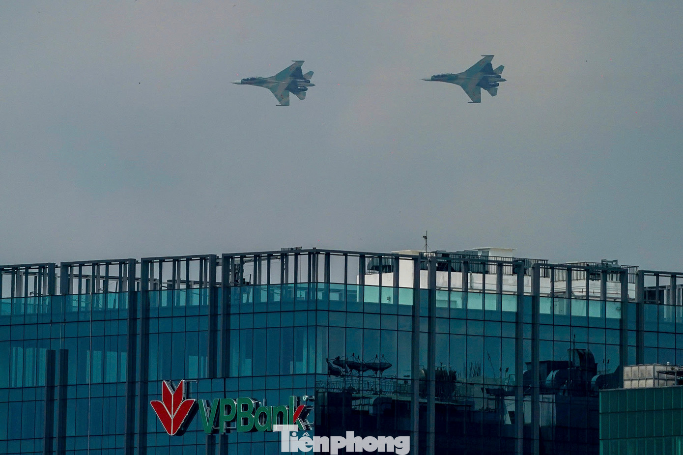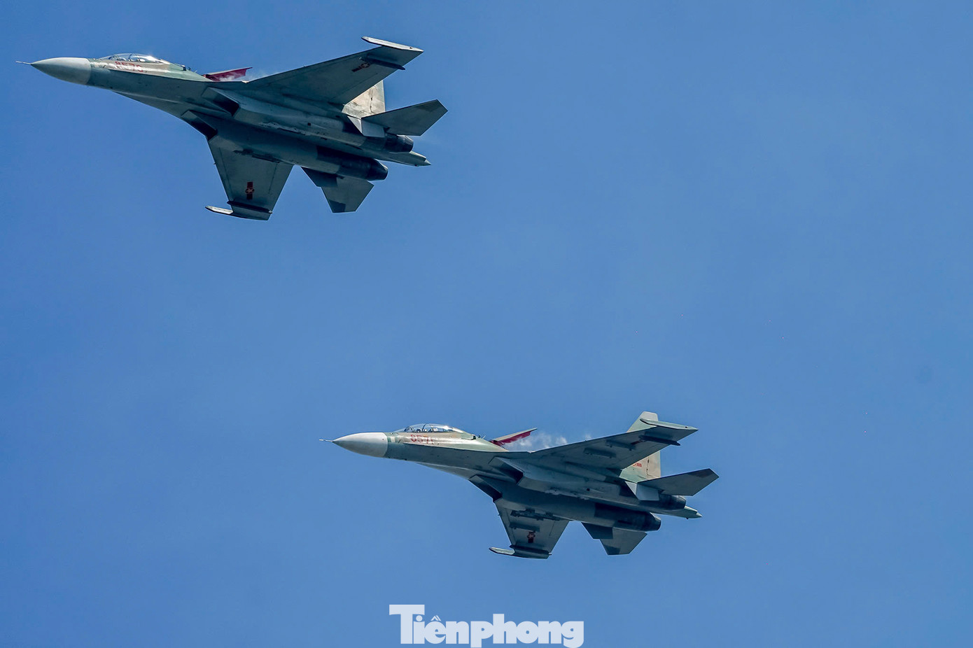| Biên đội Su-30MK2 bay lượn trên bầu trời TPHCM, sáng 23/4. |