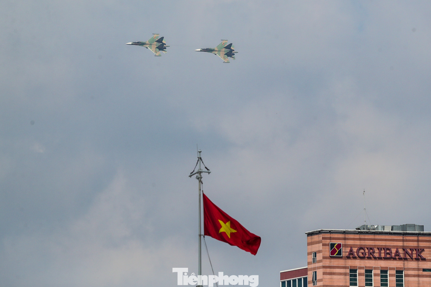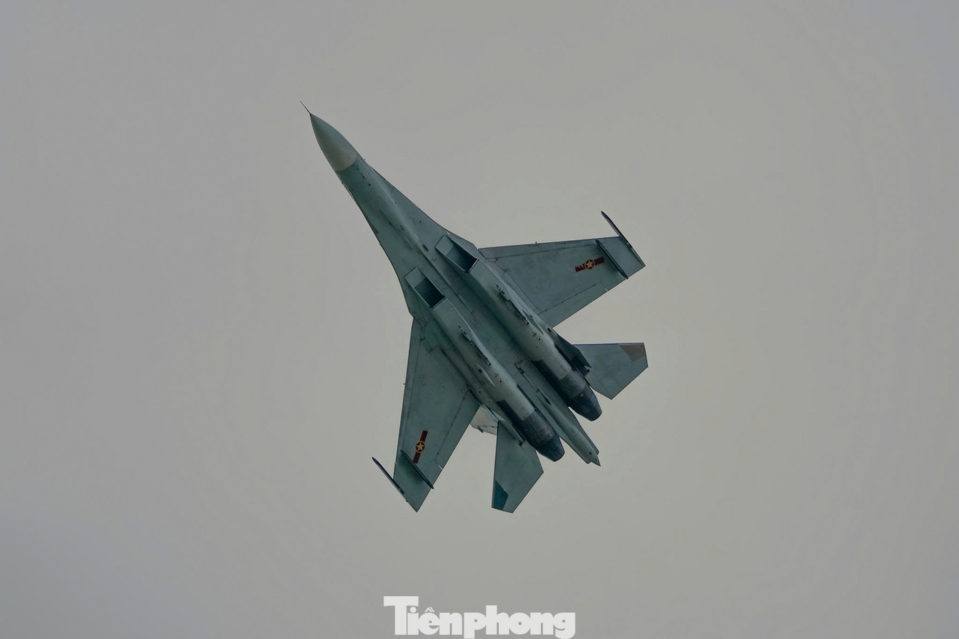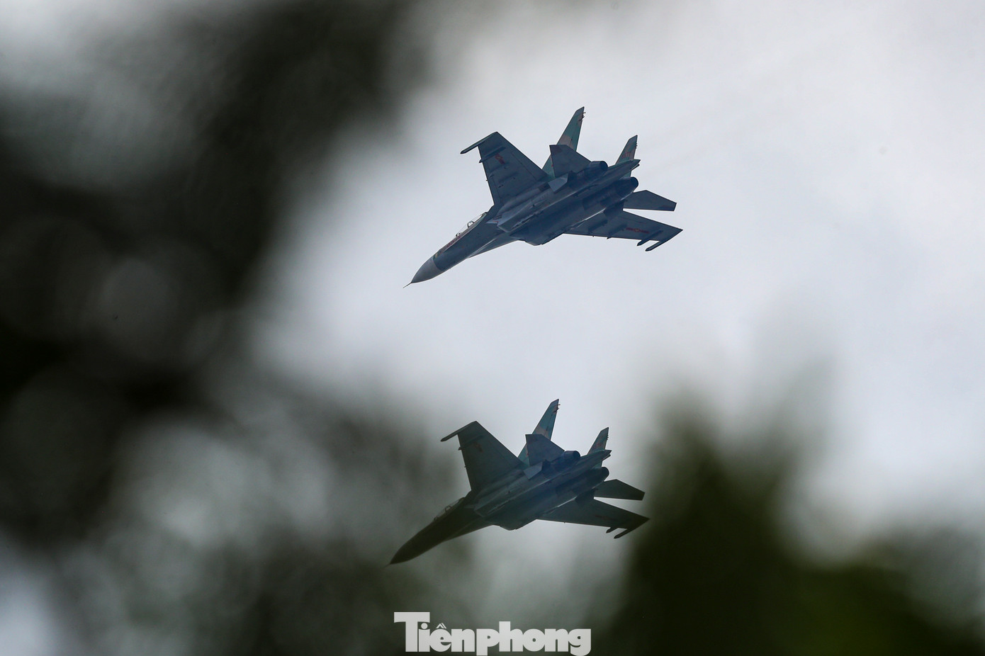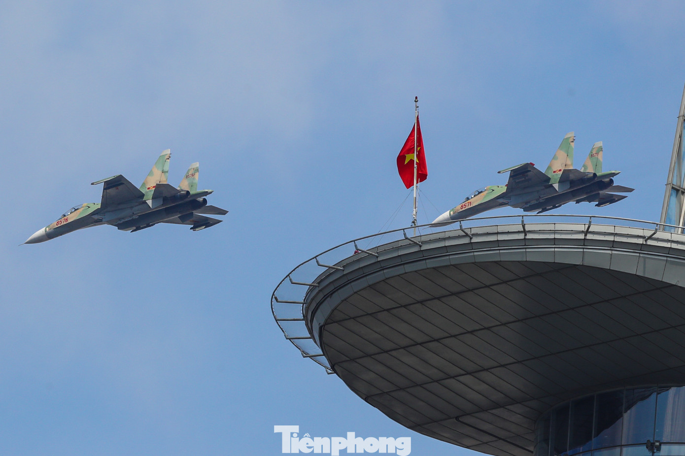 | Biên đội Su-30MK2 bay lượn trên bầu trời TPHCM, sáng 23/4. |