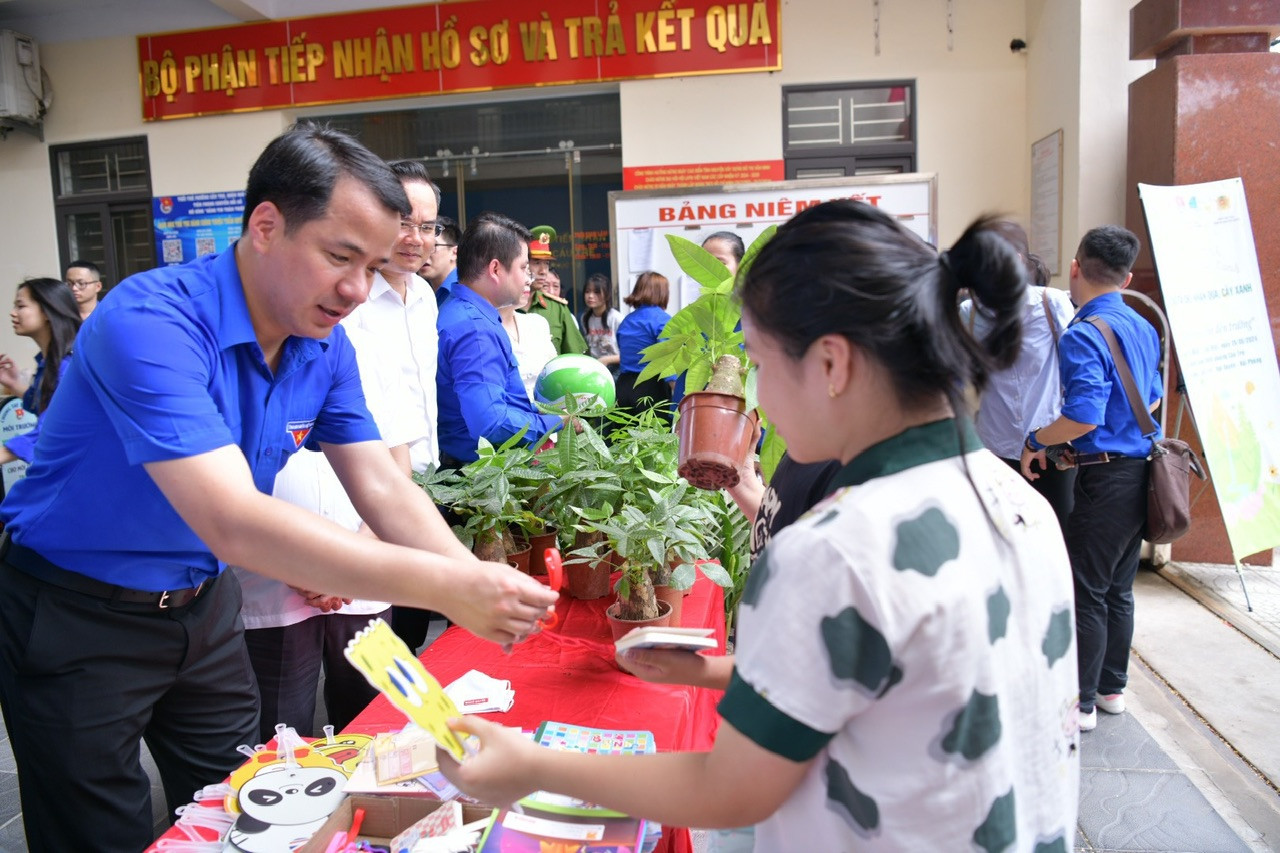 | Đồng chí Vương Toàn Thu Thủy, Ủy viên BCH Trung ương Đoàn, Bí thư Thành Đoàn TP Hải Phòng, đại diện cho các cấp bộ đoàn nhận biển tượng trưng các công trình phần việc do Trung ương Đoàn hỗ trợ. |