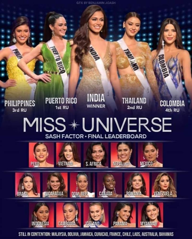 Cùng thời điểm với Global Beauties, chuyên trang Sash Factor cũng tung dự đoán Top 21, đây cũng là chuyên trang về sắc đẹp có lượng người theo dõi tương đương với Global Beauties. Theo Sash Factor, Hoa hậu Ấn Độ cũng được dự đoán sẽ đăng quang ngôi vị cao nhất, Hoa hậu Thái Lan sẽ là Á hậu 1, Hoa hậu Khánh Vân được dự đoán lọt Top với vị trí thứ 7.