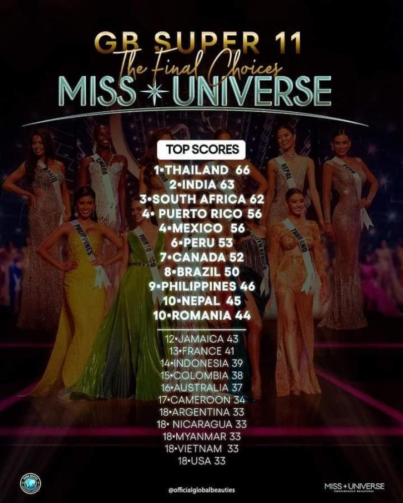 Theo Global Beauties, Hoa hậu Thái Lan sẽ giành ngôi vị cao nhất, Hoa hậu Ấn Độ sẽ là Á hậu 1, Hoa hậu Khánh Vân lọt Top ở vị trí thứ 18, đồng hạng cùng Hoa hậu Argentina, Hoa hậu Nicaragua, Hoa hậu Myanmar và Hoa hậu Mỹ.