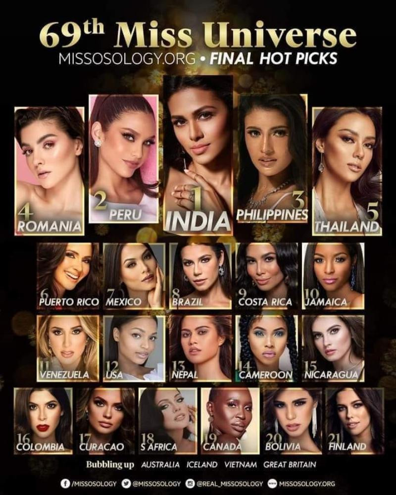 Như vậy, theo như các chuyên trang sắc đẹp này, Hoa hậu Ấn Độ hiện là cái tên sáng giá nhất cho chiếc vương miện của Miss Universe lần này. Hoa hậu Khánh Vân cũng là một trong những thí sinh được đánh giá cao, trong tổng số 74 thí sinh của Hoa hậu Hoàn vũ lần thứ 69. Đây đều là đánh giá của riêng các chuyên trang này, không liên quan tới kết quả cuối cùng của BTC Miss Universe.