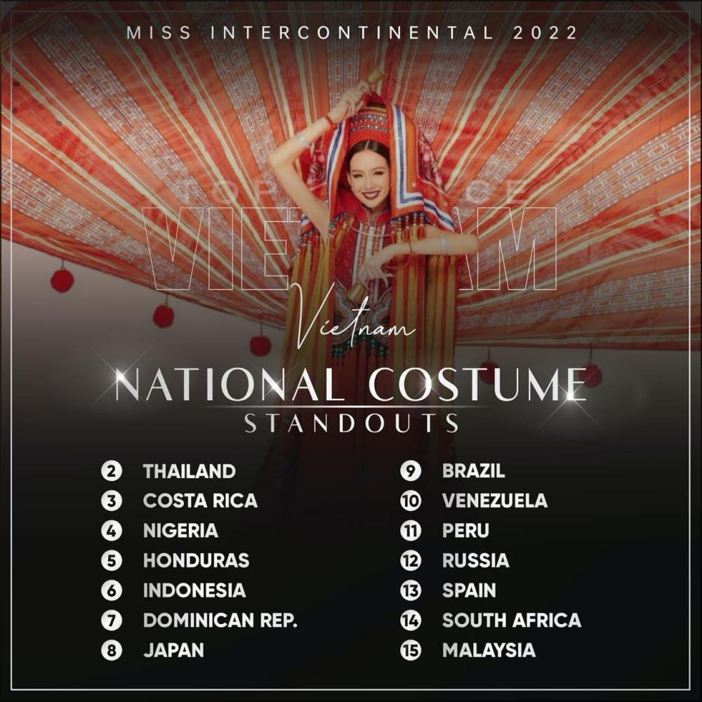HHTO - Không chỉ giành điểm số cao chót vót trong phần thi phỏng vấn (Interview), Á hậu Bảo Ngọc còn đứng đầu BXH phần thi Trang phục Dân tộc cho người hâm mộ bình chọn tại đấu trường Miss Intercontinental (Hoa hậu Liên lục địa) 2022.