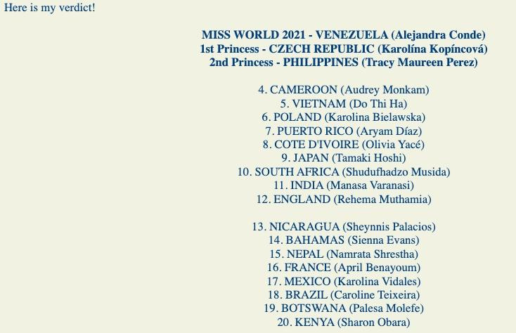 Theo đó, người đẹp giành vương miện được dự đoán là Hoa hậu Venezuela, Á hậu 1 là Hoa hậu Séc, Á hậu 2 là Hoa hậu Philippines. Hoa hậu Cameroon (đại diện của châu Phi) được xếp ở vị trí thứ 4 và Hoa hậu Đỗ Thị Hà ở vị trí thứ 5.