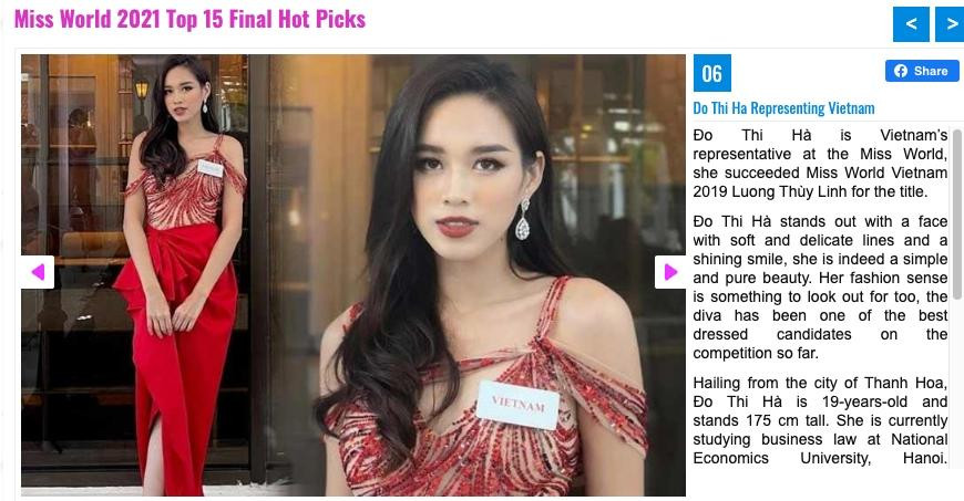 Ở một chuyên trang sắc đẹp khác là Angelopedia, Hoa hậu Đỗ Thị Hà cũng được dự đoán sẽ lọt Top 15 chung cuộc. Angelopedia khen ngợi Hoa hậu Đỗ Thị Hà có nét đẹp mềm mại và nụ cười toả sáng. Cô cũng được đánh giá là một trong những người đẹp có trang phục đẹp nhất trong cuộc thi Miss World 2021. Chuyên trang Angelopedia chỉ dự đoán Top 15 chung cuộc, và danh sách không xếp theo bất kỳ thứ tự nào.