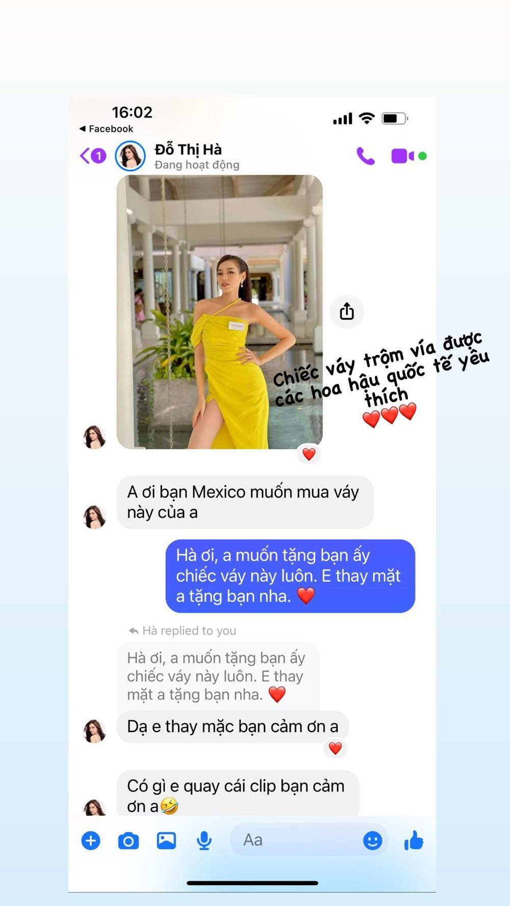 Tham dự Miss World (Hoa hậu Thế giới) 2021, Hoa hậu Đỗ Thị Hà được đánh giá là thí sinh vô cùng thân thiện, đáng yêu và tốt bụng. Nàng hậu đã cho đến 2 đối thủ mượn trang phục.