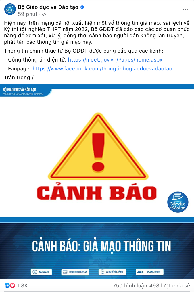 Mới đây, fanpage chính thức của Bộ GD&ĐT cũng đã đăng bài cảnh báo thí sinh và phụ huynh với nội dung: "Hiện nay, trên mạng xã hội xuất hiện một số thông tin giả mạo, sai lệch về Kỳ thi tốt nghiệp THPT năm 2022, Bộ GD&ĐT đã báo cáo các cơ quan chức năng để xem xét, xử lý, đồng thời cảnh báo người dân không lan truyền, phát tán các thông tin giả mạo này".