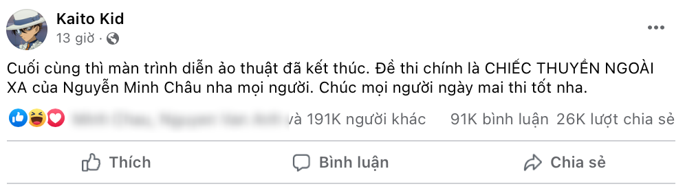 Trong khi đó, một fanpage khá nổi tiếng trên mạng xã hội tên Kaito Kid (tự giới thiệu là "trộm đề thi THPT Quốc gia") với hơn gần 400K người theo dõi cũng đăng tải bài viết với nội dung: "Cuối cùng thì màn trình diễn ảo thuật đã kết thúc. Đề thi chính là CHIẾC THUYỀN NGOÀI XA của Nguyễn Minh Châu nha mọi người. Chúc mọi người ngày mai thi tốt nha".