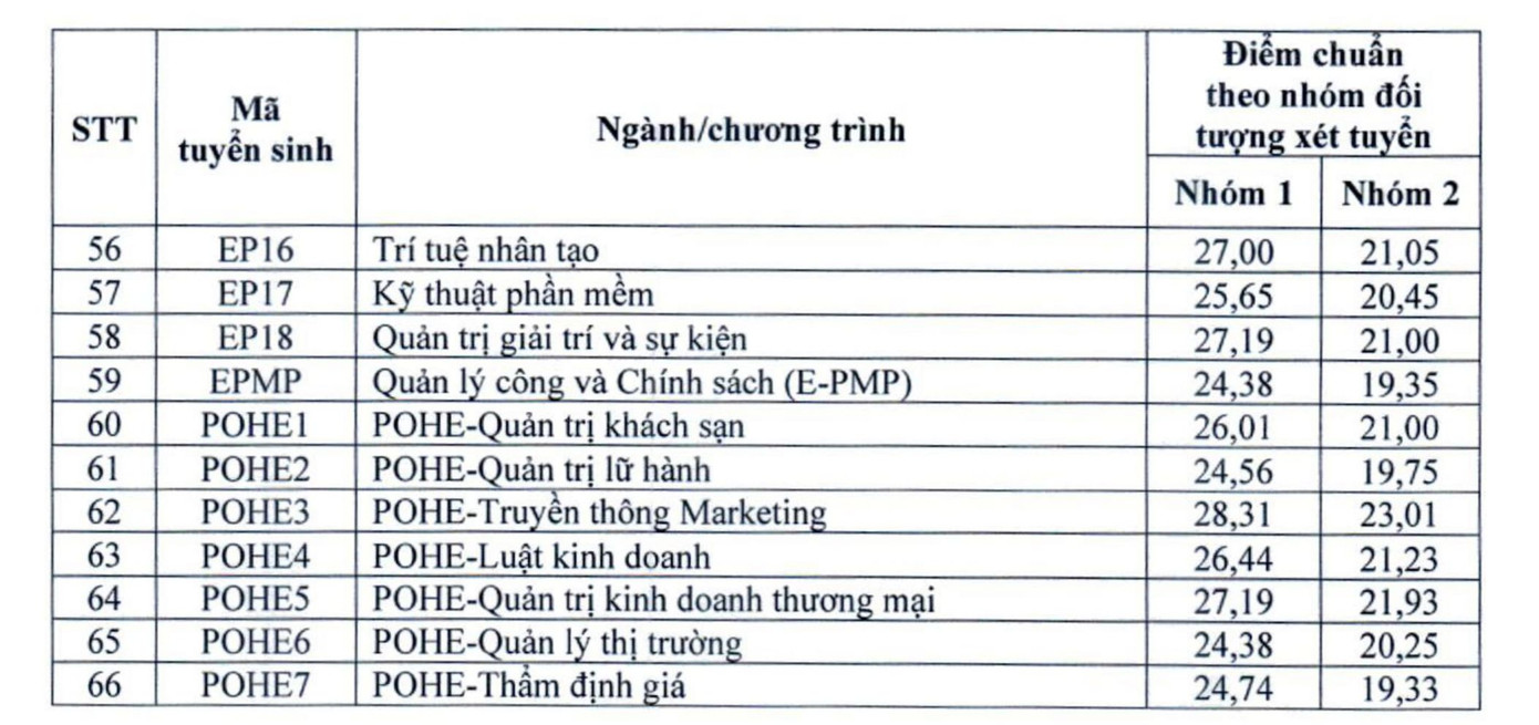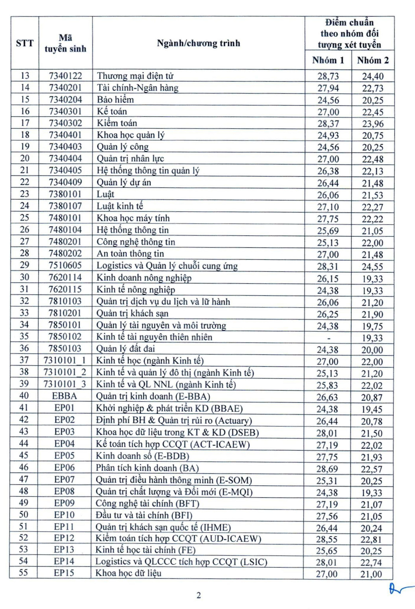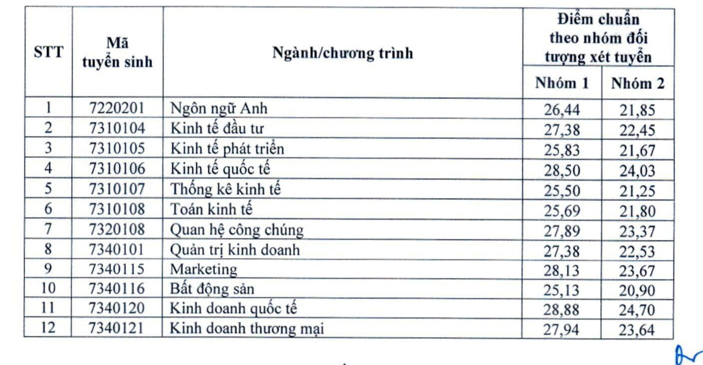 Trường Đại học Kinh tế Quốc dân vừa thông báo điểm chuẩn trúng tuyển ở phương thức xét tuyển kết hợp với thí sinh nhóm 1 và nhóm 2. Theo đó, điểm chuẩn như sau: