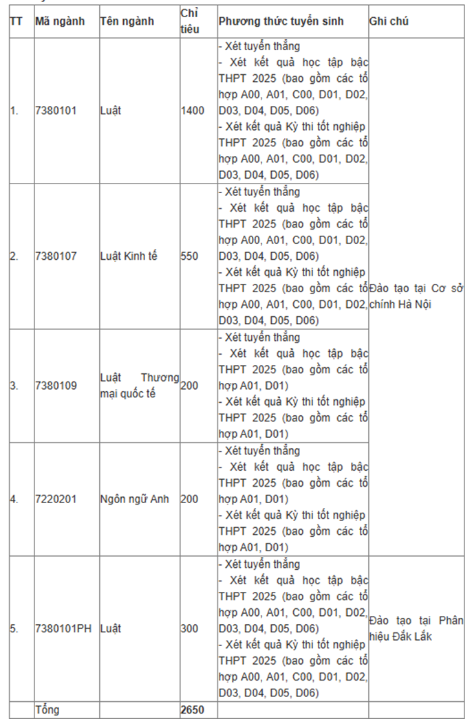 Năm 2025, Trường đại học Luật Hà Nội tuyển sinh tổng 2.650 chỉ tiêu, tăng so với năm ngoái. Các ngành, chỉ tiêu và phương thức tuyển sinh mỗi ngành cụ thể như sau: