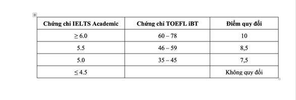- Đối với tổ hợp xét tuyển có môn Tiếng Anh, nếu thí sinh có chứng chỉ tiếng Anh IELTS Academic hoặc TOEFL iBT sẽ được quy đổi thành điểm trung bình môn Tiếng Anh trong tổ hợp xét tuyển, cách quy đổi như sau: