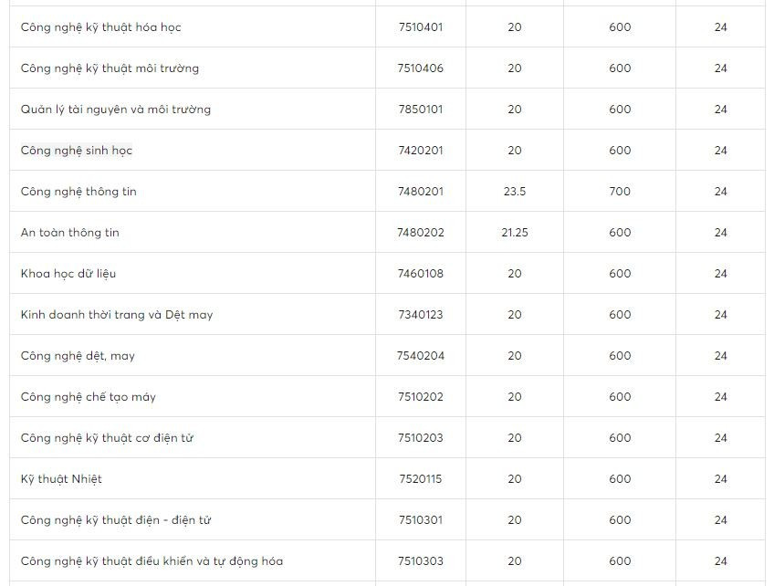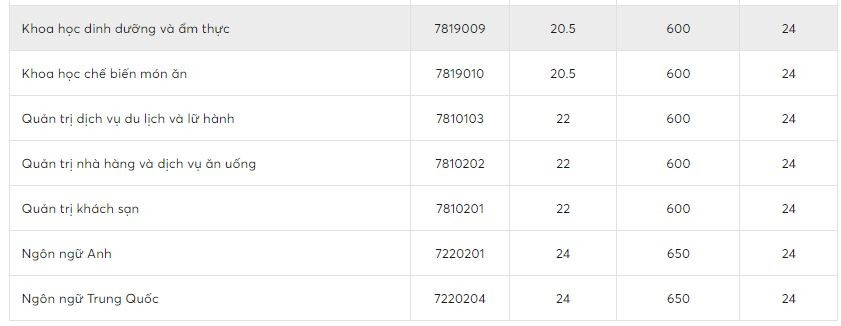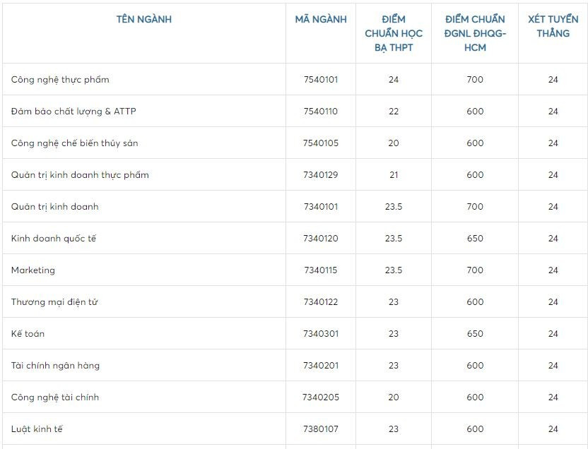 Theo đó, ở phương thức xét kết quả học tập THPT cả năm lớp 10, lớp 11 và học kỳ 1 lớp 12, điểm chuẩn dao động từ 20 – 24 điểm. Ngành có điểm cao nhất là công nghệ thực phẩm, ngôn ngữ Anh, ngôn ngữ Trung Quốc với 24 điểm. Kế đến là marketing, quản trị kinh doanh, kinh doanh quốc tế, công nghệ thông tin với 23,5 điểm. Các ngành còn lại với 20 điểm.