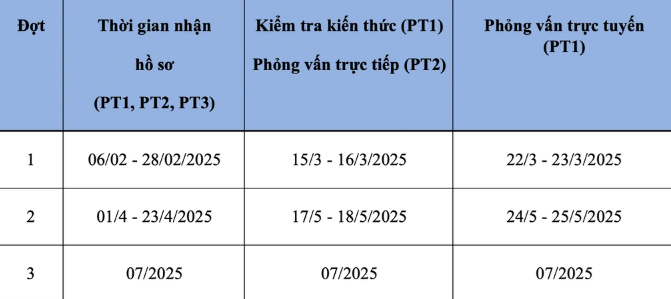 Với phương thức 1, phương thức 2 và phương thức 3., USTH dự kiến tổ chức 3 đợt tuyển sinh, trong đó có 2 đợt trước kỳ thi tốt nghiệp THPT và 1 đợt sau kỳ thi tốt nghiệp THPT.