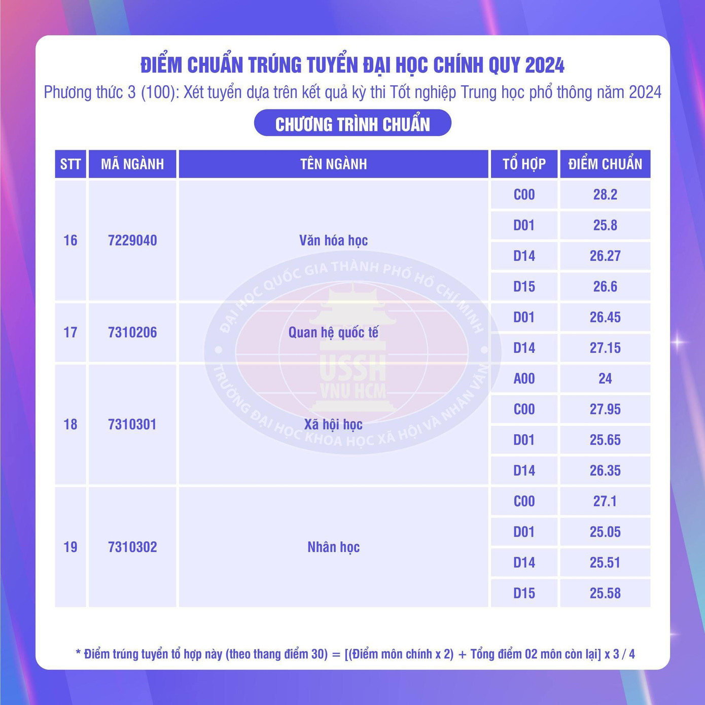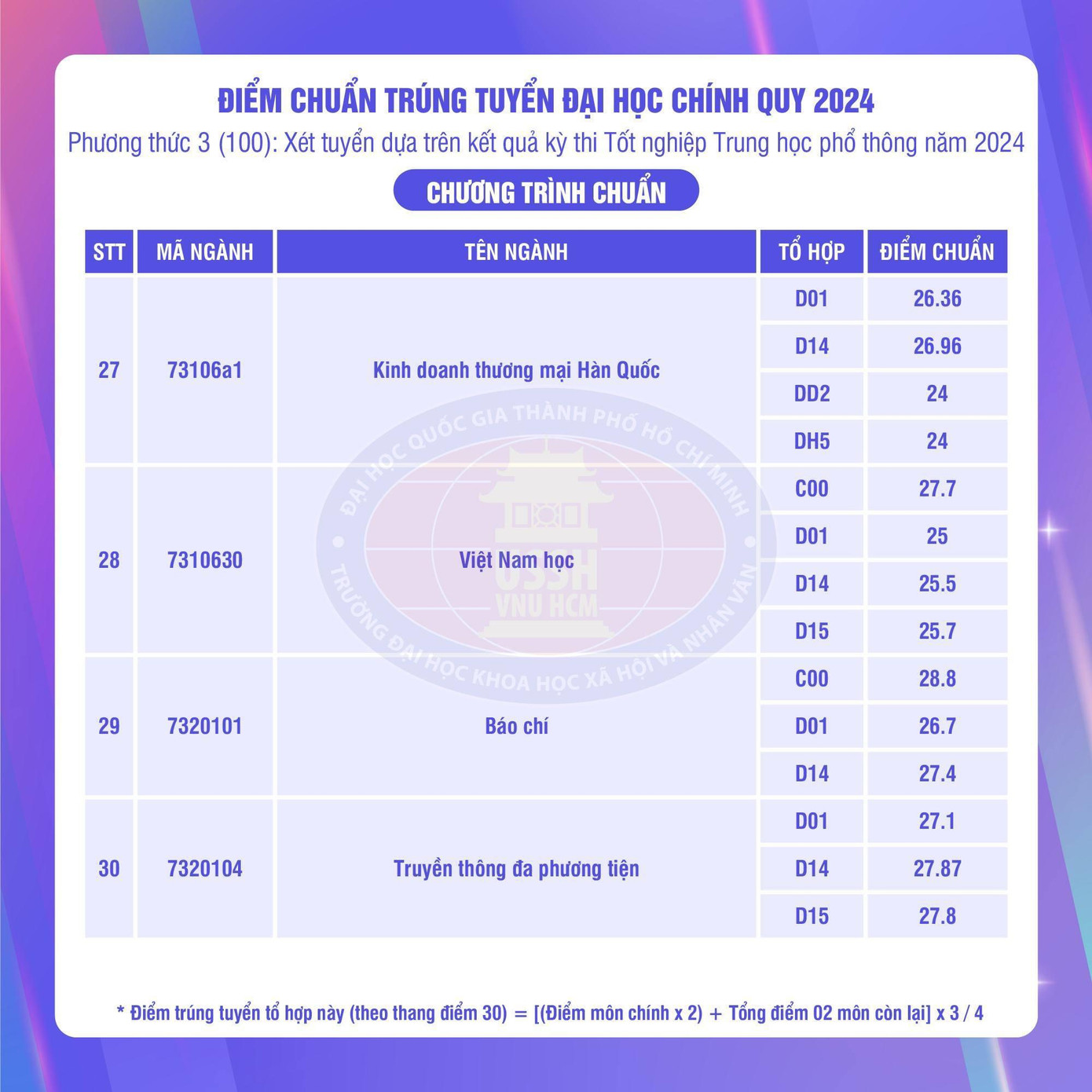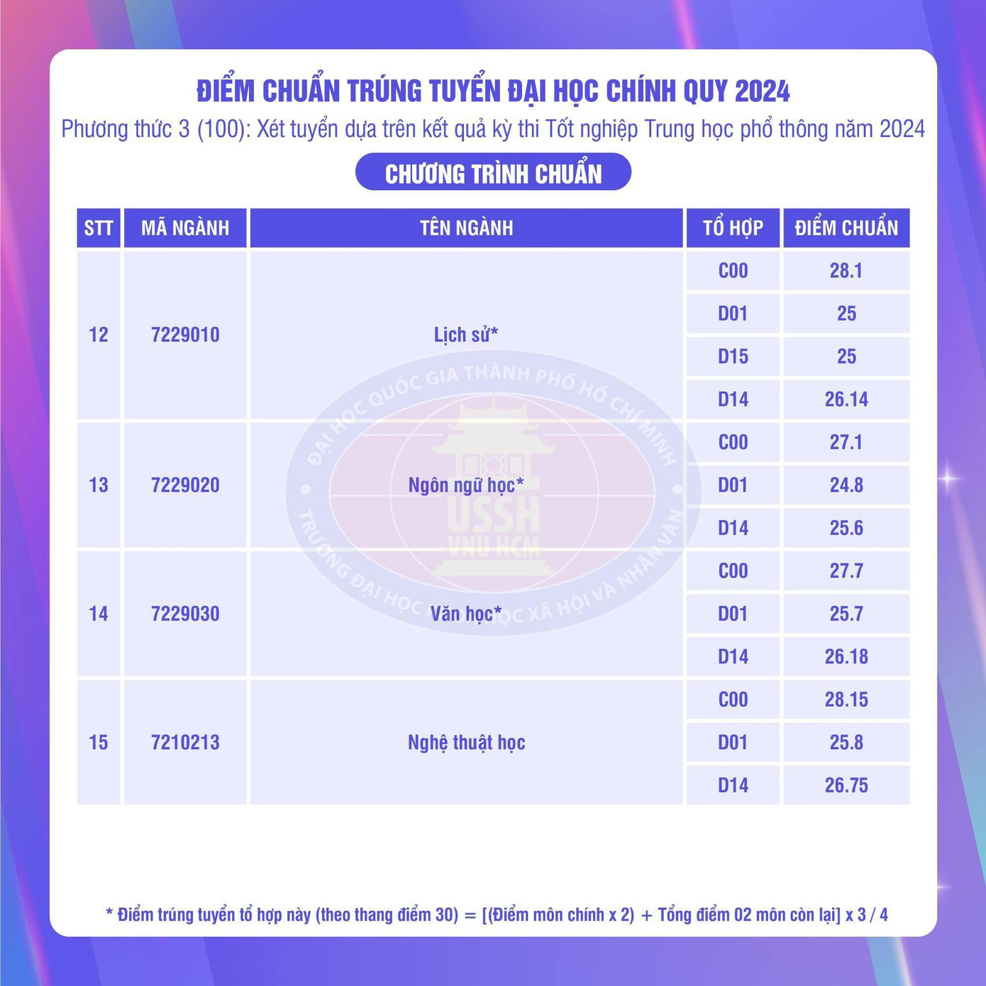 Sáng 18/8,Hội đồng Tuyển sinh Trường ĐH Khoa học Xã hội và Nhân văn TPHCM công bố điểm chuẩn trúng tuyển đại học chính quy năm 2024 bằng phương thức xét tuyển dựa trên kết quả kỳ thi Tốt nghiệp THPT.