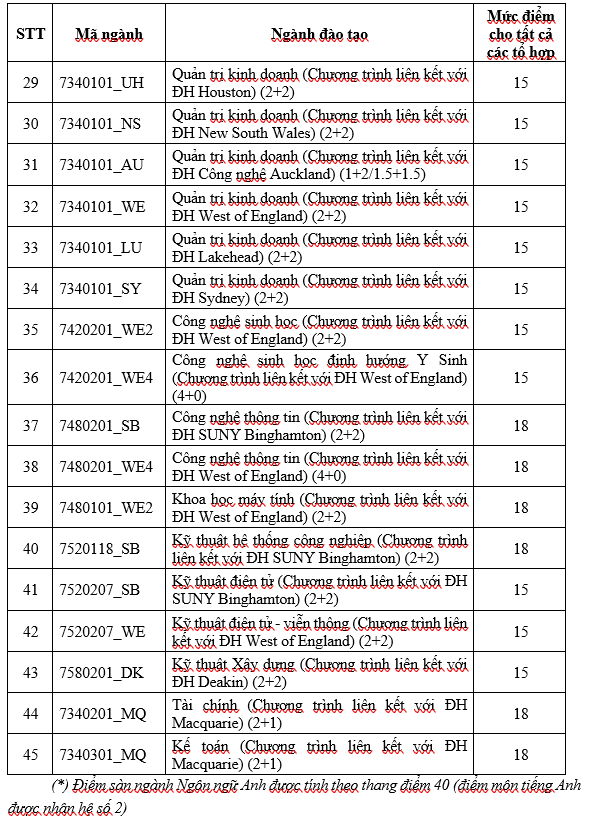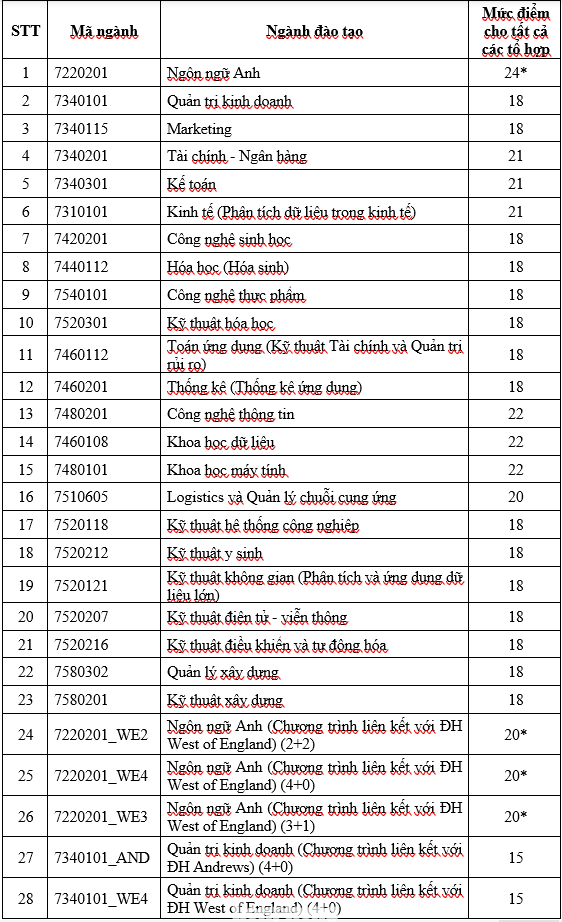 Đặc biệt, ngành Ngôn ngữ Anh có mức điểm sàn khác với các ngành còn lại vì được tính theo thang điểm 40 với điểm môn tiếng Anh được nhân hệ số 2.