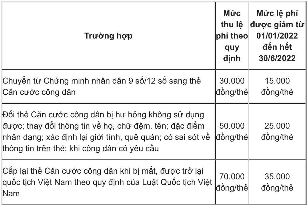Cụ thể, theo Thông tư số 120/2021/TT-BTC của Bộ Tài chính, kể từ 01/01/2022 đến hết ngày 30/6/2022, mức thu lệ phí cấp Căn cước công dân được tính bằng 50% mức thu lệ phí quy định tại Điều 4 Thông tư số 59/2019/TT-BTC.