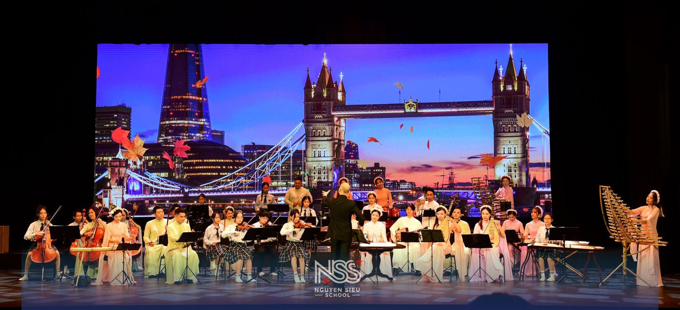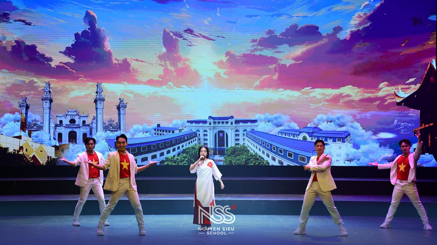 Đan xen trong chương trình “Sải cánh giữa trời xanh” là các tiết mục hòa tấu nhạc cụ dân tộc, hợp xướng, nhảy hiện đại với sự tham gia của học sinh Nguyễn Siêu.