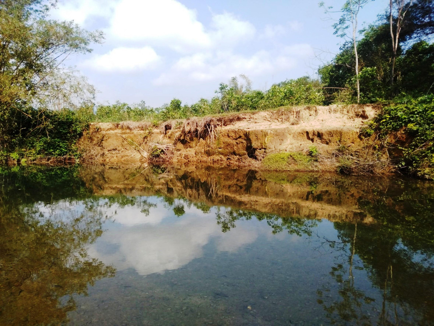| Một lũy tre già giữ đất đã bị nước sông Bù Lu nhấn chìm, sau khi nạn sạt lở ăn sâu vào bên trong |