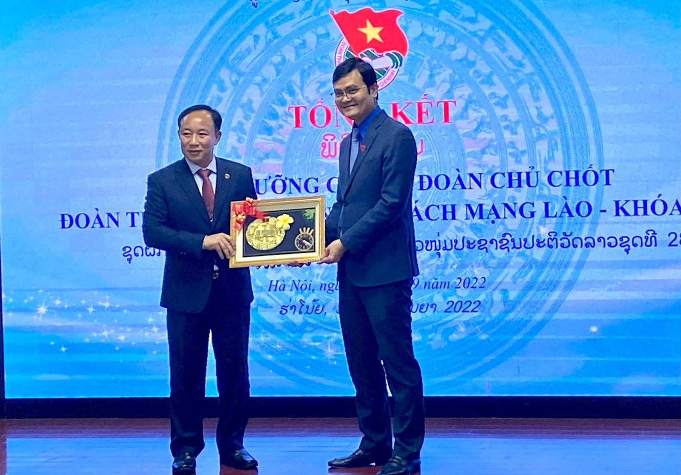 | Bí thư thứ nhất T.Ư Đoàn Bùi Quang Huy (bên phải) và anh Thông-chăn Phu-mi-văn , Phó Bí thư BCH T.Ư Đoàn TNND Cách mạng Lào tại lễ bế mạc lớp bồi dưỡng |