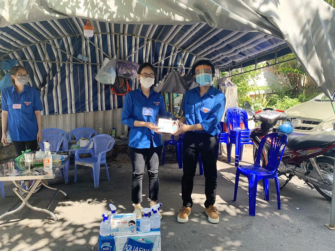 | Các shipper áo xanh tặng khẩu trang, nước sát khuẩn cho các điểm chốt kiểm soát phòng chống dịch trên địa bàn TP Tuy Hòa - ảnh H.O |