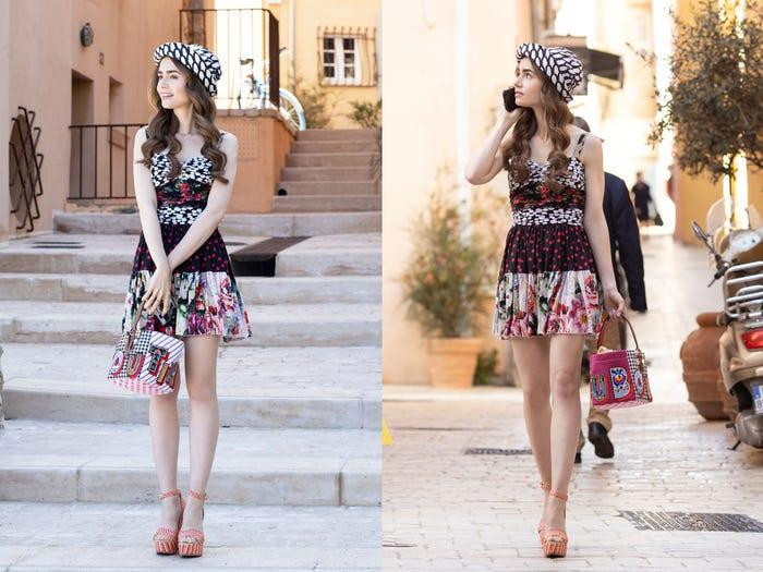 Emily đi dạo trên đường phố Pháp khi mặc chiếc váy Dolce & Gabbana, có hoạt tiết hoa, họa tiết chấm bi, và họa tiết động vật. Và cô nàng mang theo một chiếc túi in họa tiết do Christian Louboutin thiết kế, vô cùng hợp tông.