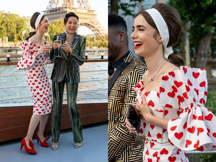 Trong một bữa tiệc, Emily đã mặc một chiếc váy dáng dài có họa tiết trái tim, trông nổi bần bật. Đây là một thiết kế của Anouki. Cô trông rất tươi tắn, xinh đẹp, cổ điển mà chấm phá.