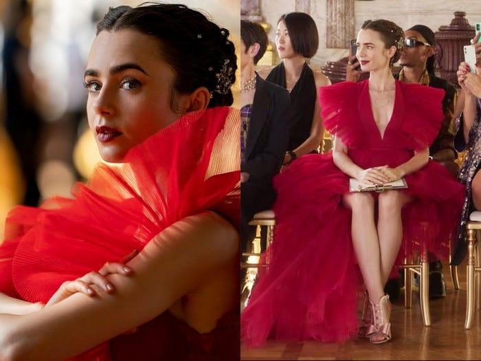 Chiếc váy màu đỏ tươi Emily mặc trong tập cuối mùa 2 là một trong những bộ trang phục ấn tượng nhất, được miêu tả là “Marie Antoinette hiện đại”. Chiếc váy có đường viền cổ chữ V sâu, bồng bềnh, kết hợp với nhau đầy ấn tượng.