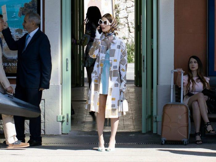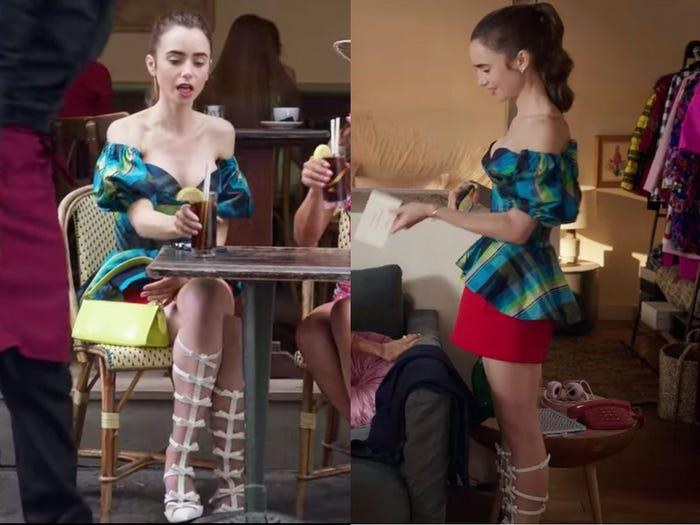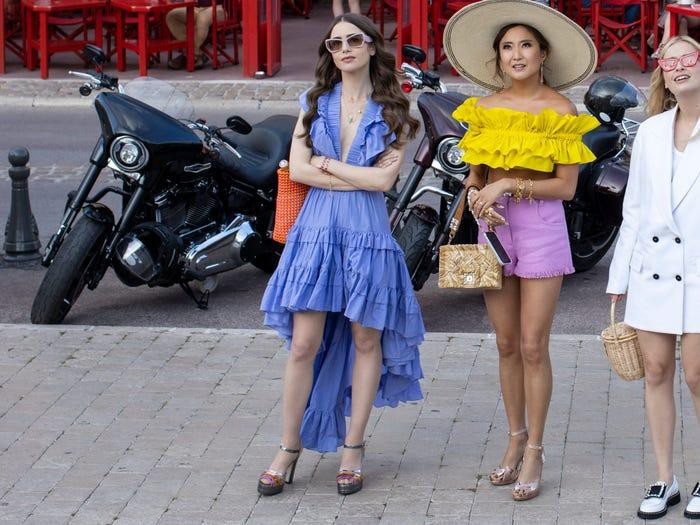 Chiếc váy màu hoa oải hương mà Emily diện khi đi nghỉ ở miền Nam nước Pháp ngập tràn ánh nắng là một thiết kế bởi Magali Pascal. Những đường bèo nhún phóng đại, phần lưng hở và chiếc váy cạp cao là biểu hiện của sự ăn mừng, là niềm vui của việc ăn diện.