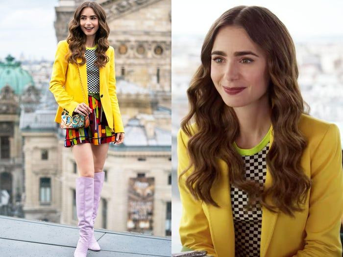 Trong tập 5 Emily in Paris mùa 2, Emily hẹn Camille đi ăn trưa, và cô mặc một chiếc áo ba lỗ kẻ caro, một chiếc váy nhiều màu, một đôi bốt cao đến đầu gối màu hoa oải hương. Rực rỡ nhất là chiếc áo khoác nỉ màu vàng. Để hoàn thiện bộ trang phục, Emily mang theo một chiếc túi đeo chéo nhỏ Dolce & Dabbana.
