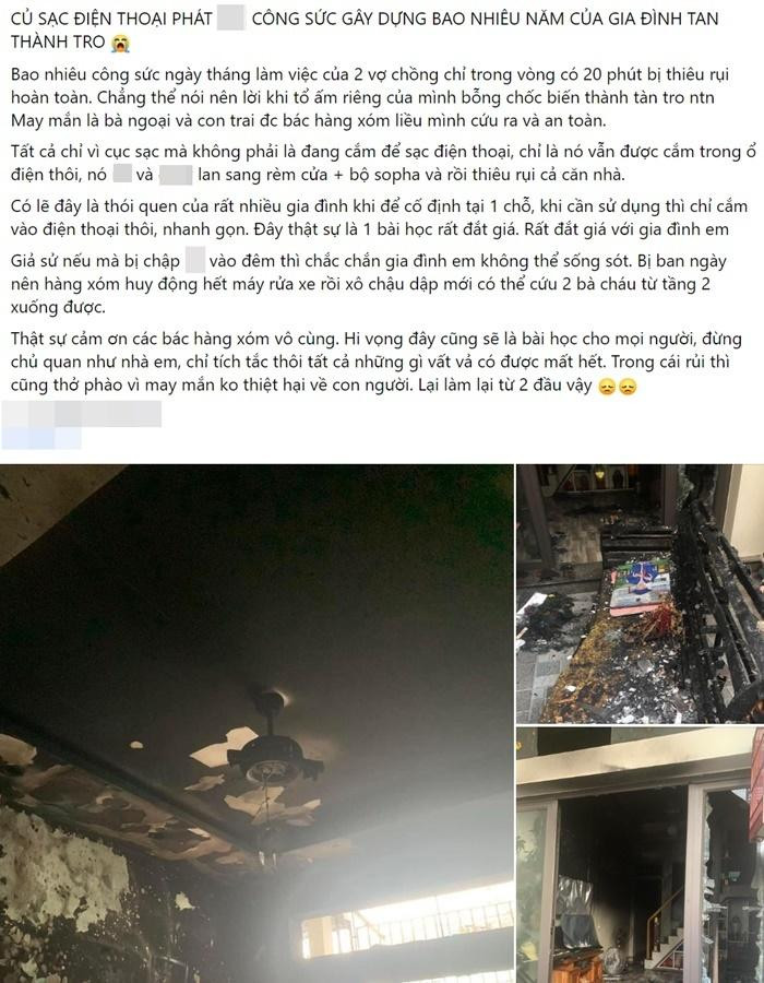 “Cục sạc điện thoại nổ và cháy lan sang rèm cửa, bộ sofa và lan ra hết, trong khi điện thoại không hề sạc. Nghe rất bình thường vì đa số gia đình nào cũng cắm một chỗ không rút ra. Rồi lúc nào cần chỉ cắm vào thôi. Đây là một bài học rất đắt giá. Rất đắt giá với gia đình”, Q.T viết.