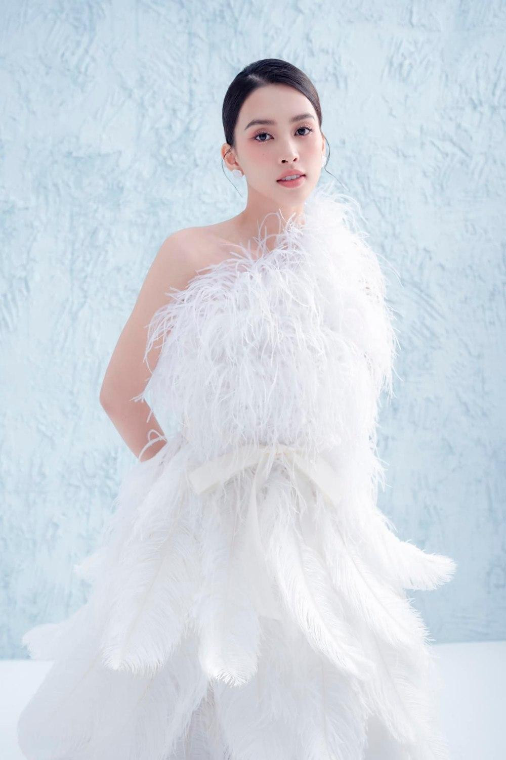Xem ra Thiên Ân rất có duyên với trang phục đính lông vũ. Trong một sự kiện, nàng hậu lộng lẫy như đóa hoa trong bộ váy lông vũ thướt tha trắng muốt. Thiên Ân vốn rất hợp với màu son đỏ rực và khi đi cùng trang phục trắng, nhìn cô chẳng khác gì công chúa Bạch Tuyết.