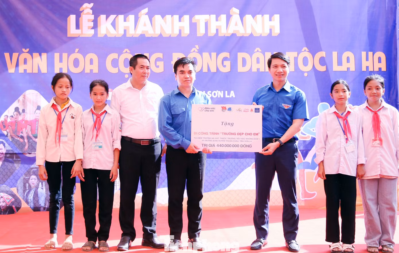Đồng thời, trao biển tượng trưng hỗ trợ xây dựng 7 công trình “Trường đẹp cho em”; 3 công trình “Ngôi Nhà Hạnh Phúc” cho trẻ em mồ côi có hoàn cảnh khó khăn; 1 công trình “Sân chơi thiếu nhi”. Hỗ trợ trang thiết bị cho Nhà Văn hóa Cộng đồng dân tộc La Ha.