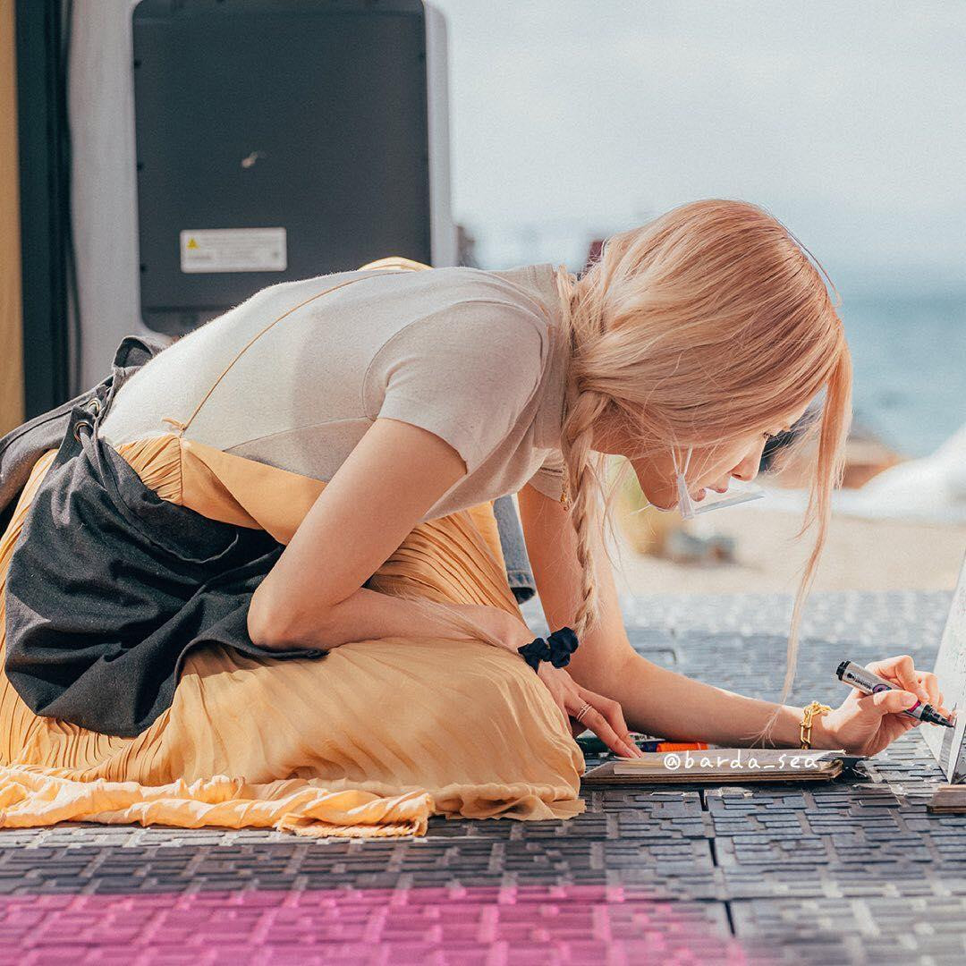Thêm vào đó, Rosé mặc set đồ này để tham gia show thực tế Sea of Hope, trong đó cô vừa ngồi đàn hát bên bờ biển, vừa làm phục vụ bàn cho quán bar mà dàn cast của chương trình điều hành.