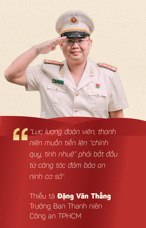 Thời gian qua, tuổi trẻ Công an TPHCM đã có nhiều dấu ấn về các mô hình trong đảm bảo an ninh cơ sở, nổi bật như “bản đồ số” phòng chống tội phạm, chiến dịch bóc gỡ quảng cáo sai quy định, mô hình Tổ nhân dân tuần tra, mô hình Thanh niên công nhân phòng chống tụ tập đông người hay Đội phản ứng nhanh về ANTT tại các bến xe khách liên tỉnh… Trên cơ sở đó, Thiếu tá Đặng Văn Thắng - Trưởng Ban Thanh niên Công an TPHCM nhận định, lực lượng đoàn viên, thanh niên muốn tiến lên “chính quy, tinh nhuệ” phải bắt đầu từ công tác đảm bảo an ninh cơ sở.