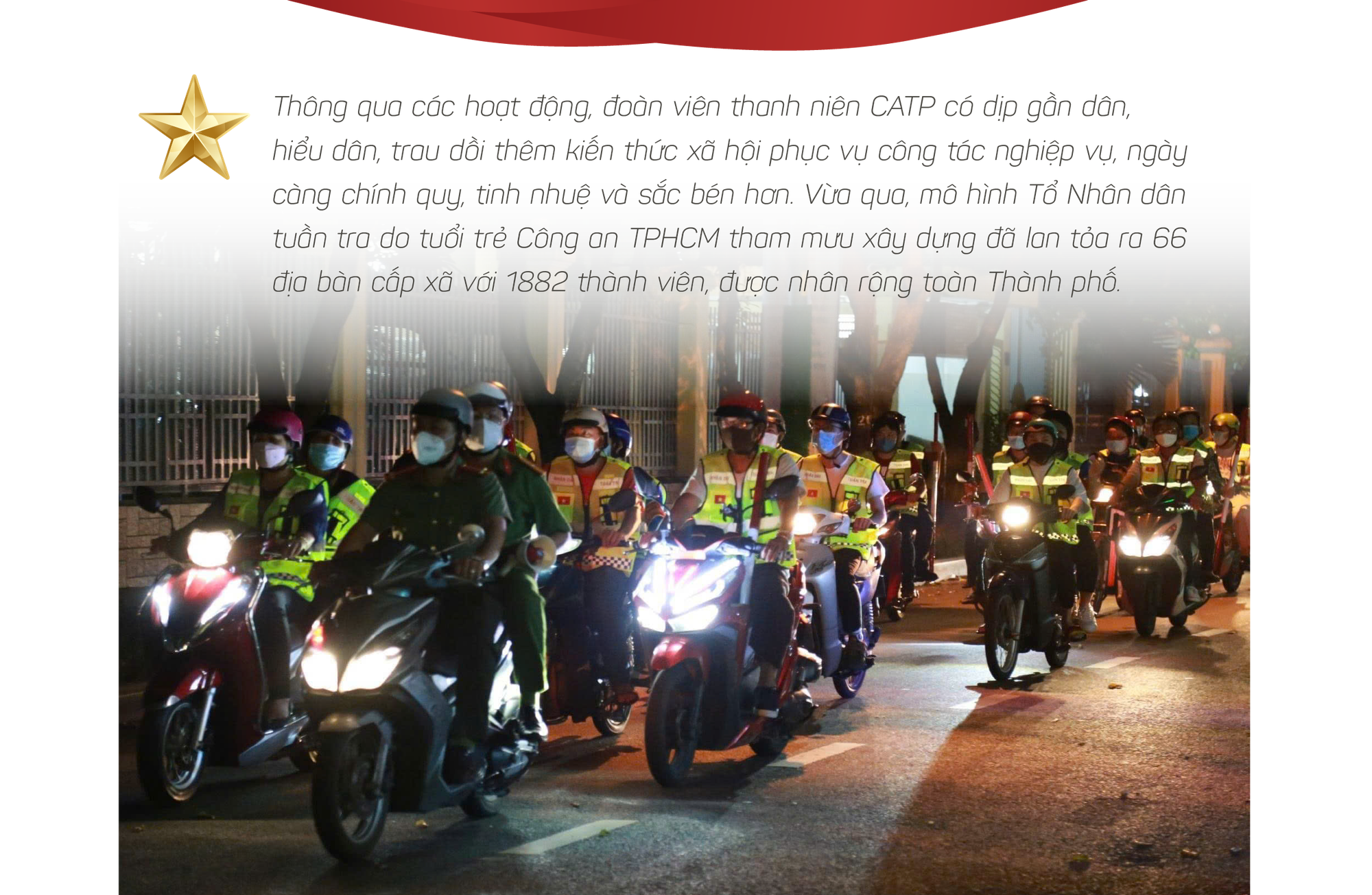 Bên cạnh đó, tuổi trẻ Công an TPHCM cũng phát triển mạnh mẽ phong trào toàn dân bảo vệ an ninh Tổ quốc bằng việc xung kích nâng cao chất lượng các đội hình Nhân dân tự quản về an ninh trật tự trên địa bàn.