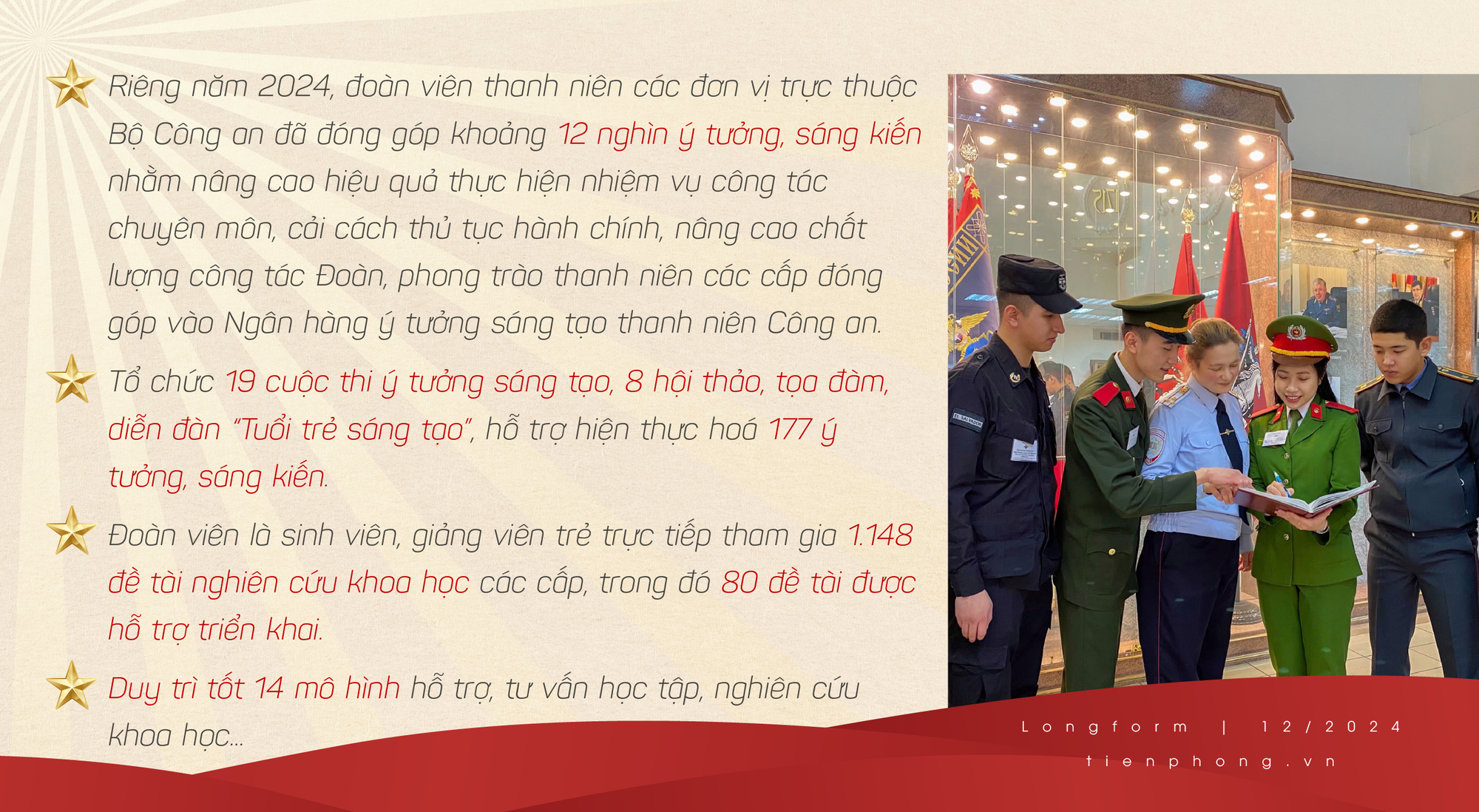 Theo Thượng tá Đồng Đức Vũ - Trưởng Ban Thanh niên CAND, việc triển khai thực hiện Nghị quyết 12 của Bộ Chính trị là cơ hội thuận lợi để mỗi cán bộ, chiến sĩ trẻ ra sức học tập, nâng cao trình độ chính trị, pháp luật, nghiệp vụ, ứng dụng khoa học công nghệ, chuyển đổi số phục vụ công tác Công an, qua đó không ngừng nâng cao hiệu quả các mặt công tác, đáp ứng yêu cầu, nhiệm vụ trong tình hình mới.