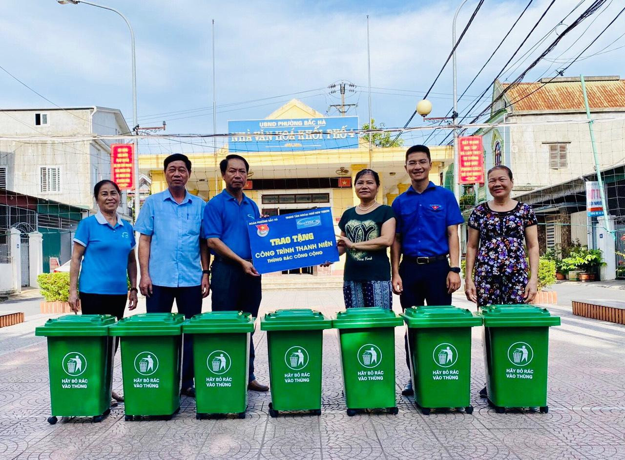 | Trao tặng Thùng rác bảo vệ môi trường và hỗ trợ xây dựng công trình thắp sáng đường điện. (Ảnh: TH) |