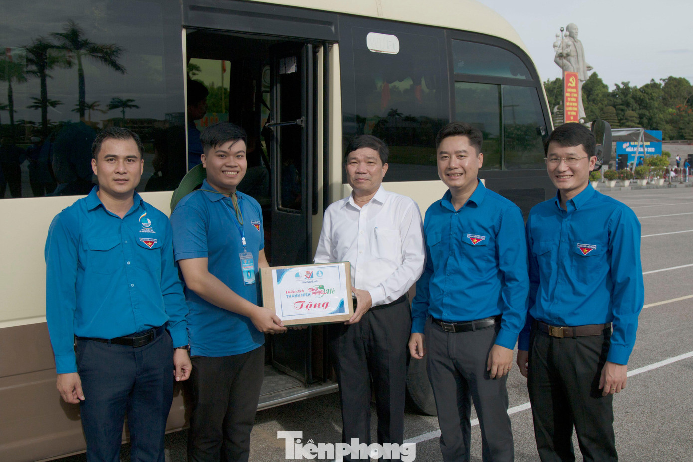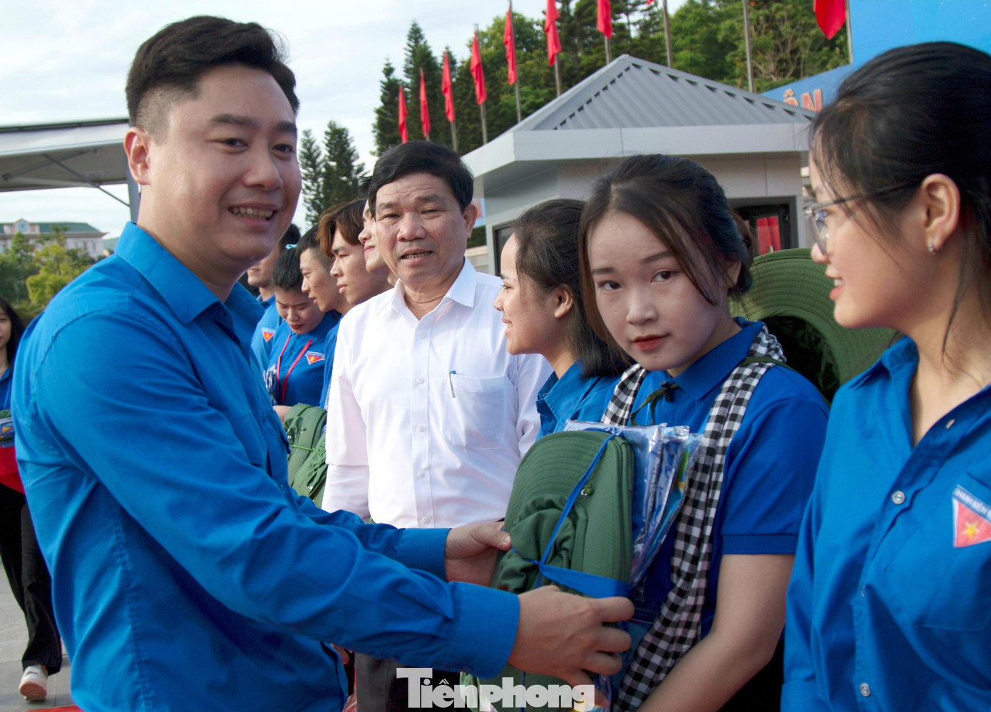 | Đại biểu, thanh niên tình nguyện chụp hình lưu niệm tại Quảng trường Hồ Chí Minh trước khi xuất quân lên xã biên giới Tam Thái, huyện Tương Dương. |
