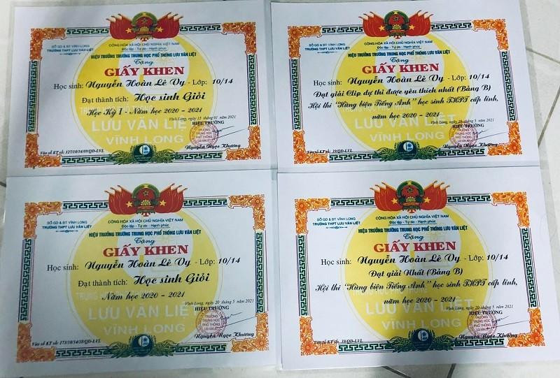 Không chỉ gặt hái được thành công trong lĩnh vực khởi nghiệp Lê Vy còn sở hữu thành tích học tập đáng nể. Ở lớp, cô bạn là một lớp trưởng năng nổ. Ngoài thời gian học, Vy cũng thường xuyên tham gia các hoạt động, phong trào của nhà trường.